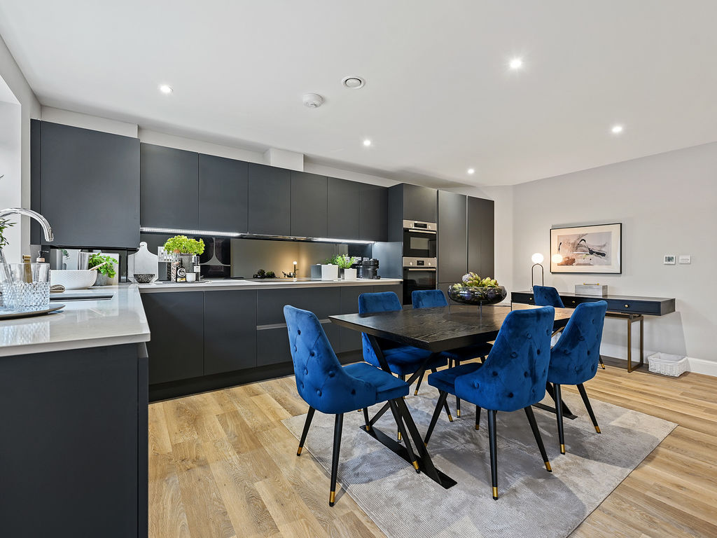 A large hall with multiple storage cupboards leads through to the open plan kitchen/dining/living room which opens to a private terrace or balcony. The principal bedroom en suite has a walk-in shower, while the family bathroom has a bath.